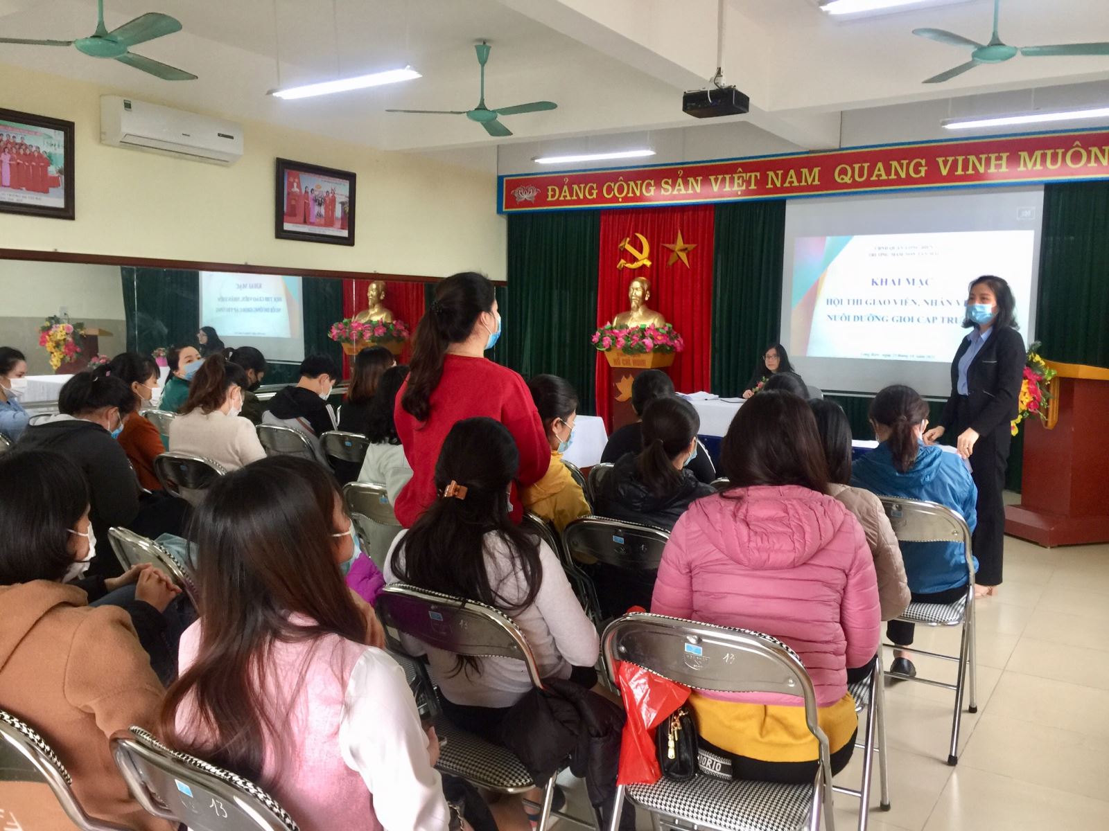 Đồng chí Trương Thị Hoa phụ trách chuyên môn và đồng chí Nguyễn Thị Thu Hà phụ trách nuôi dưỡng lên khai mạc hội thi, phổ biến quy chế, thể lệ hội thi.