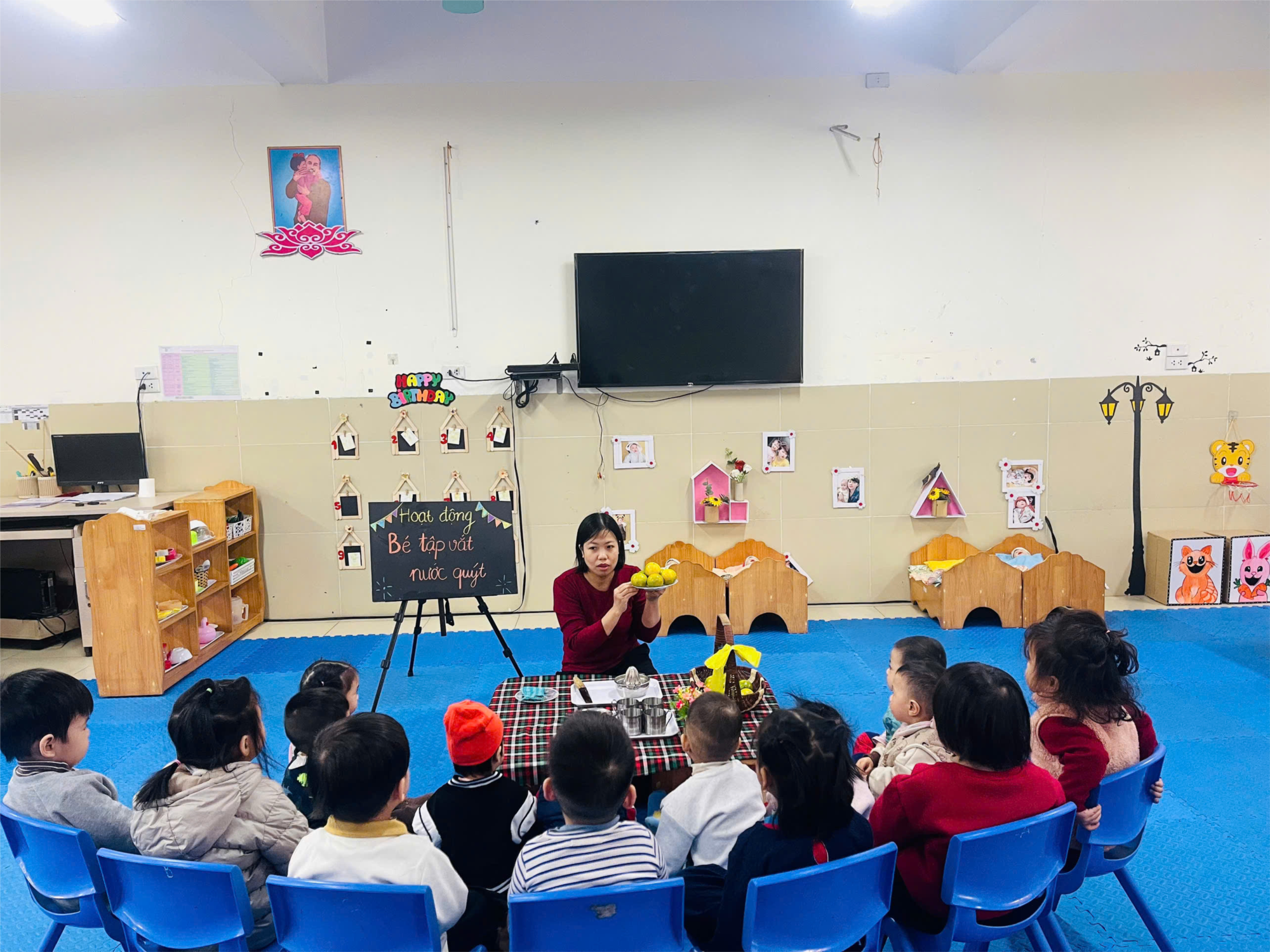Nhằm giúp các bé rèn luyện kỹ năng vận động tinh và khám phá thế giới xung quanh qua những trải nghiệm thực tế, hôm nay, các bạn nhỏ lớp Nhà trẻ D2 đã có một hoạt động vô cùng thú vị – Bé tập vắt nước quýt. Dưới sự hướng dẫn tận tình của cô giáo, các bé được làm quen với quả quýt, quan sát màu sắc, ngửi mùi thơm và cảm nhận độ mềm của vỏ quýt. Sau đó, các con hào hứng tự tay cho vào dụng cụ và tập vắt nước. Dù đôi bàn tay nhỏ bé có chút vụng về, nhưng ánh mắt các con lại ánh lên sự thích thú và phấn khởi khi từng giọt nước quýt thơm ngon chảy ra.