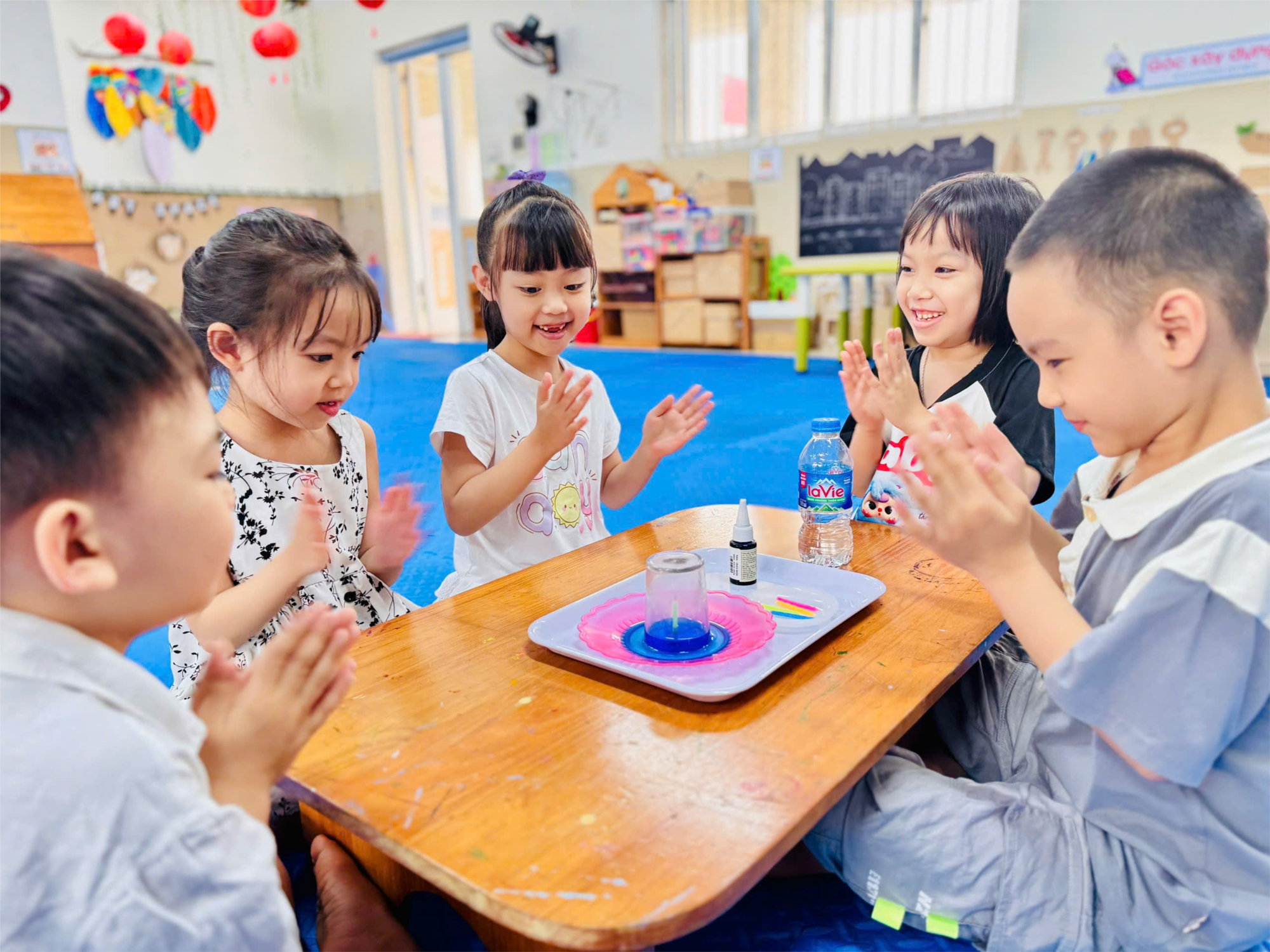 Sau khi quan sát cô thực hiện thí nghiệm, trẻ được chia thành các nhóm nhỏ và tự tay thực hiện lại các bước dưới sự hướng dẫn của cô. Các bé cùng nhau gắn nến, đổ nước, nhỏ màu và hồi hộp quan sát khi úp cốc. Không khí lớp học trở nên sôi nổi khi trẻ vừa làm vừa trao đổi, dự đoán và chia sẻ kết quả với bạn.