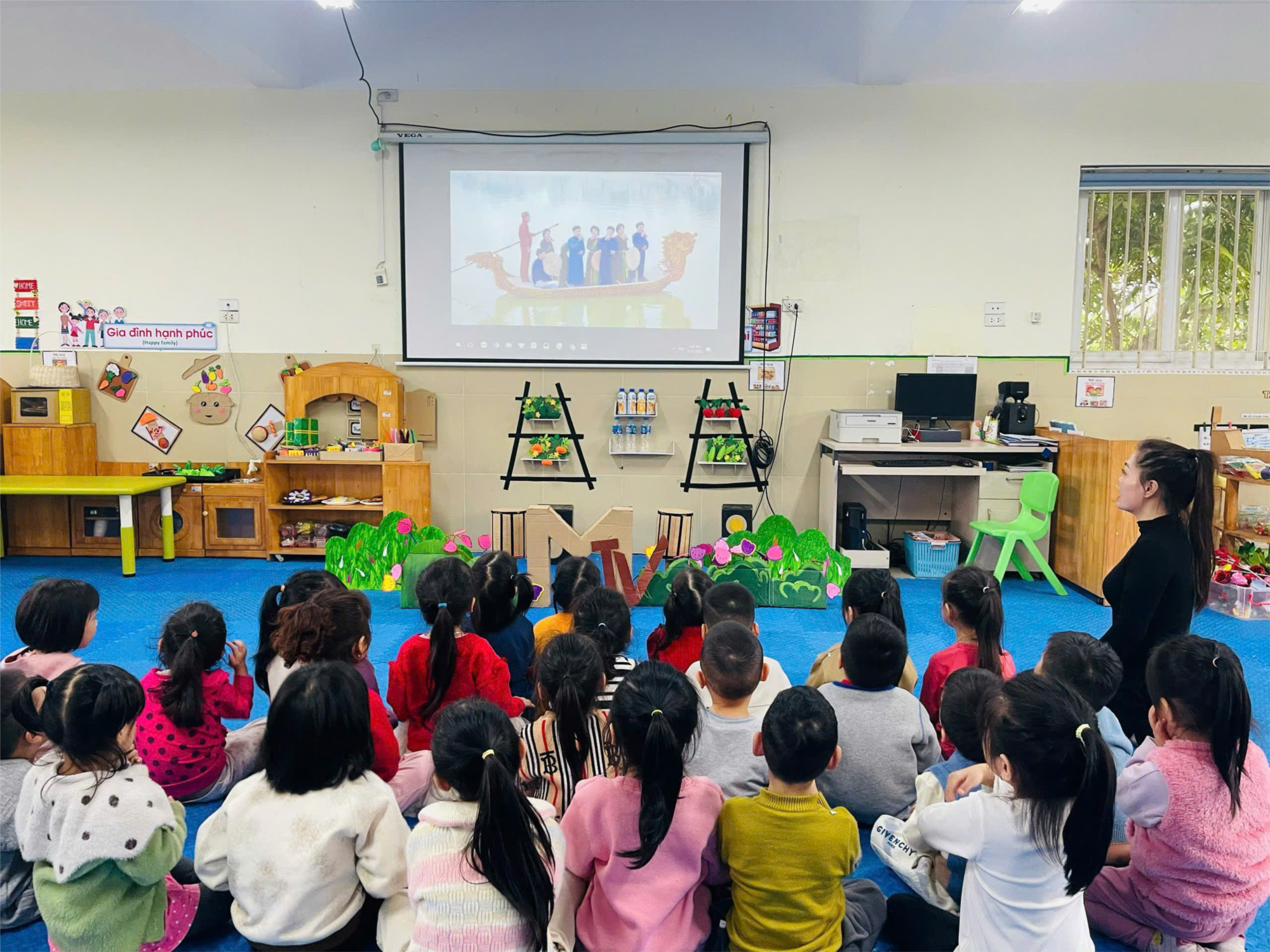 Trong không gian ấm cúng và vui tươi của lớp học, cô giáo đã giới thiệu cho các bé những đặc trưng nổi bật của mùa xuân như: thời tiết ấm áp, cây cối đâm chồi nảy lộc, hoa đào, hoa mai khoe sắc, những chú chim ríu rít ca hát. Các bé được cùng cô xem tranh ảnh và video về mùa xuân, đồng thời thảo luận về những điều các bé thấy khi mùa xuân đến.