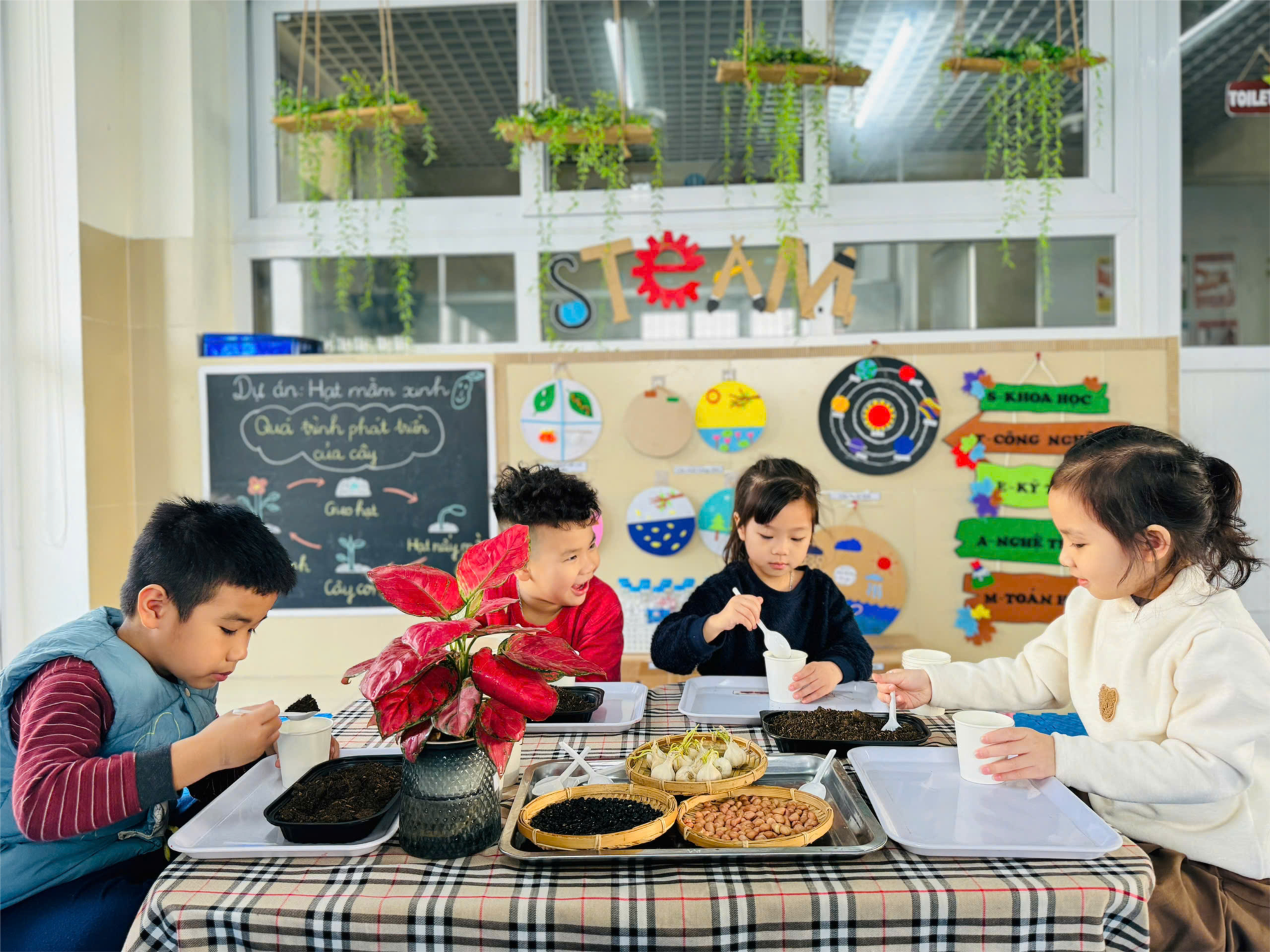 Chúng tớ đã được các cô chuẩn bị cho những khay hạt giống với rất nhiều loại hạt: lạc, đỗ đen, tỏi. Mỗi bạn sẽ được chọn nhứng loại hạt giống mà mình thích để bắt đầu gieo hạt. Đầu tiên, chúng mình sẽ lấy đất cho vào cốc. Sau đó, chúng tớ sẽ nhẹ nhàng đặt hạt giống vào trong đất. Và để cho hạt giống nảy mầm thì hàng ngày chúng tớ phải chăm sóc chúng bằng tình yêu thương, sự kiên nhẫn đấy. Các bạn hãy cùng chờ đón điều đặc biệt gì sẽ xảy ra sau một thời gian nhé.
