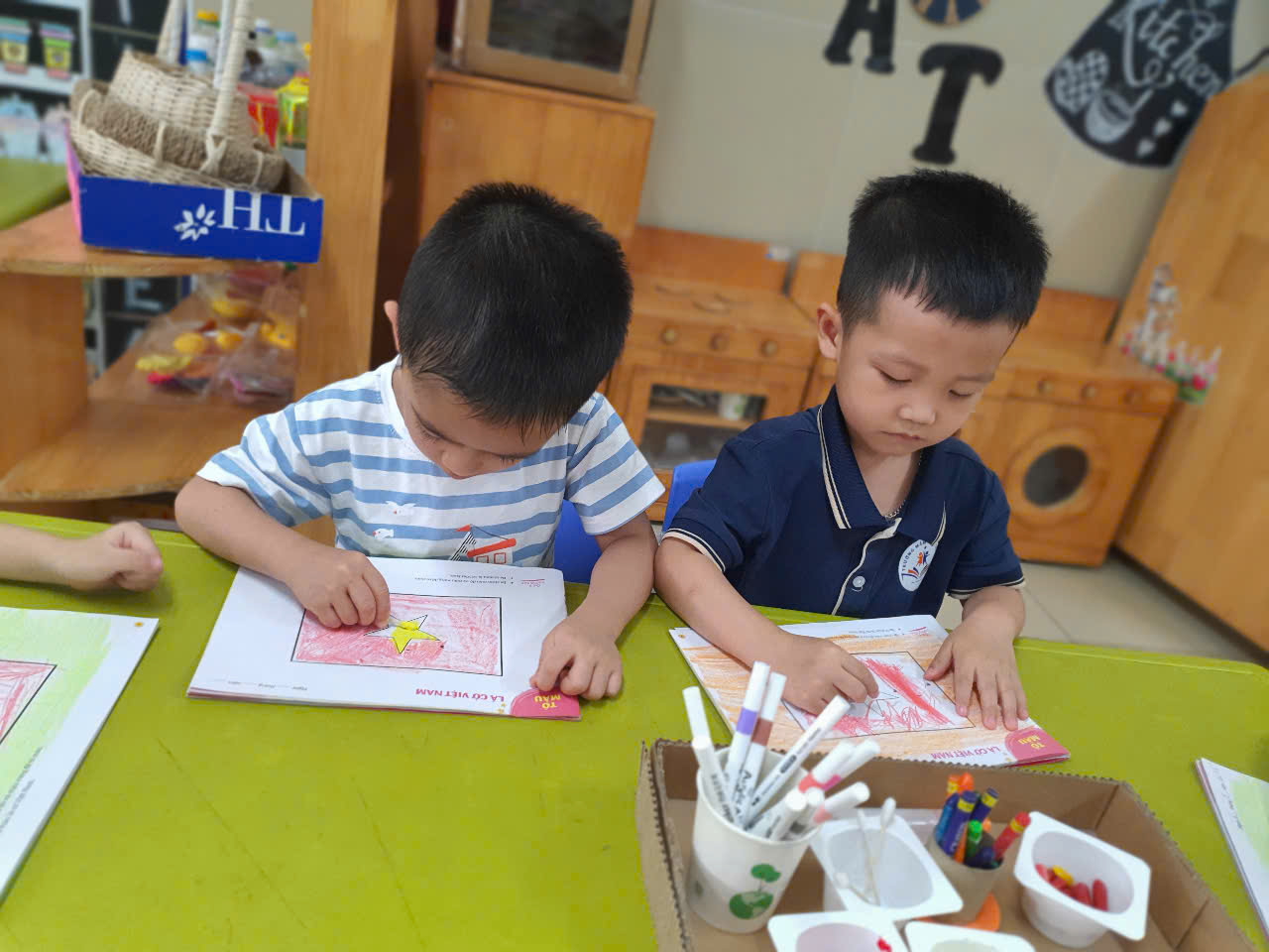 Dưới sự hướng dẫn của cô giáo, các bé đã được làm quen với hình ảnh lá cờ đỏ sao vàng – biểu tượng thiêng liêng của dân tộc Việt Nam. Hoạt động không chỉ mang lại niềm vui mà còn giúp trẻ phát triển nhiều kỹ năng quan trọng: kỹ năng cầm bút, phối hợp tay – mắt, nhận biết màu sắc và hình dạng cơ bản. Đồng thời, trẻ bước đầu hình thành tình cảm với biểu tượng Tổ quốc, nuôi dưỡng lòng yêu nước từ những trải nghiệm đầu đời.