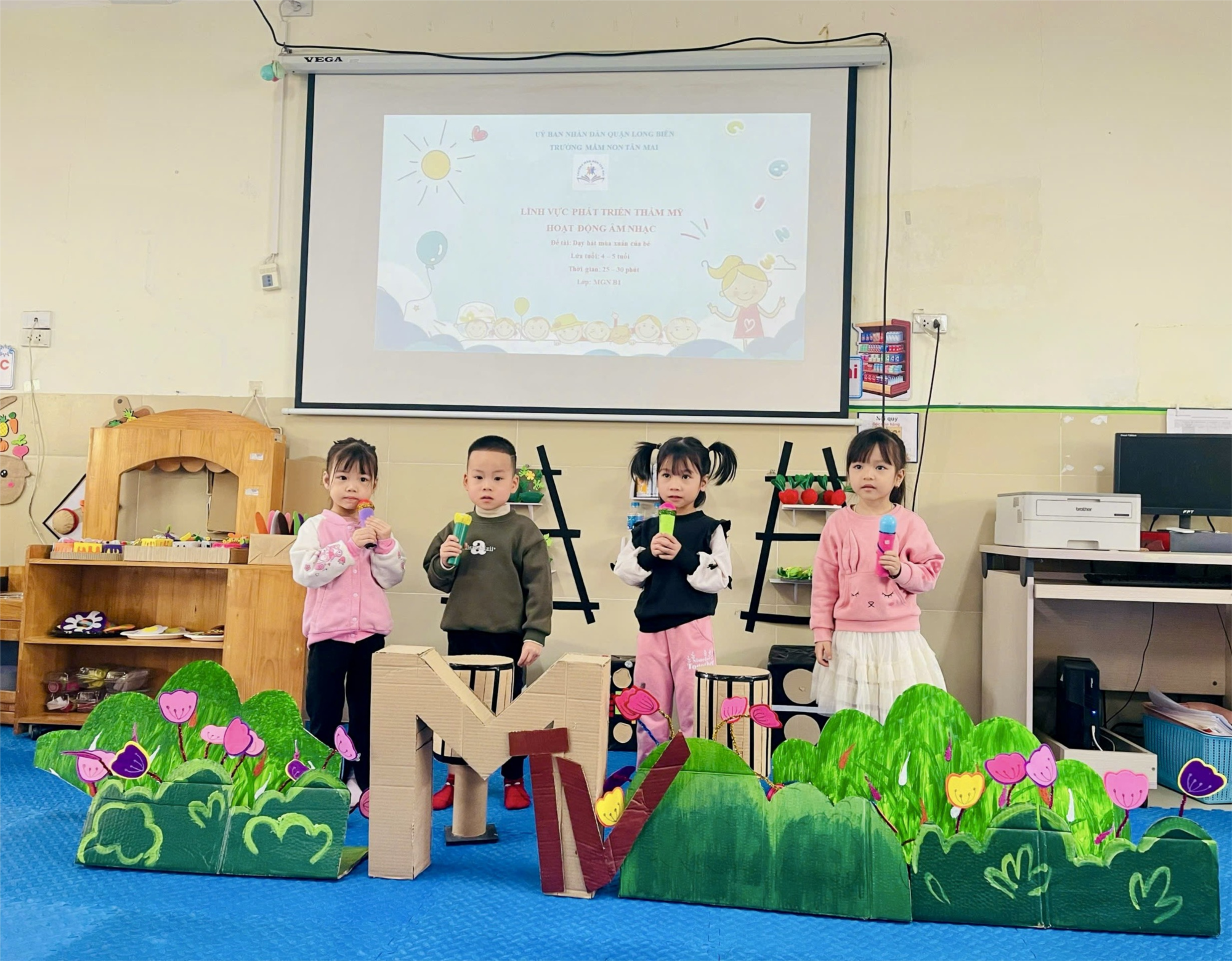 Dưới sự hướng dẫn của cô giáo, các bé không chỉ học hát mà còn được vận động theo nhạc, giúp phát triển khả năng cảm thụ âm nhạc và tăng cường sự tự tin. Những bài hát về mùa xuân như “Ngày Tết quê em”, “Mùa xuân ơi”, hay “Bé chúc Tết” vang lên, tạo nên bầu không khí rộn ràng, hứng khởi.